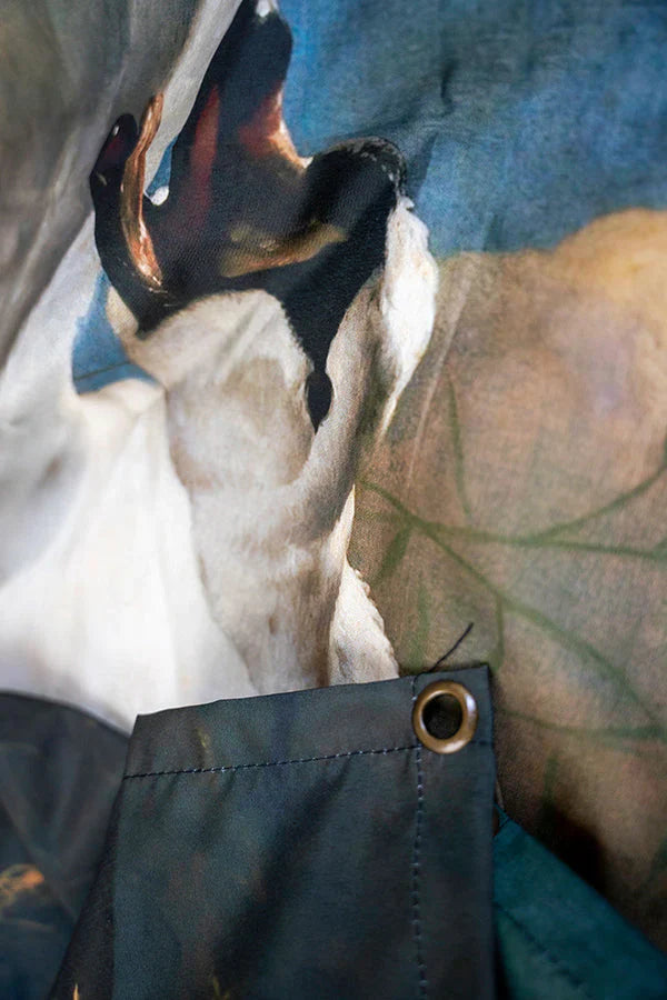 The Threatened Swan Tapestry is an elegant yet fierce work of art because of the meaning behind the work. It represents a swan fiercely protecting its nest from an approaching dog, and displays the swan in a flaming aura. This is an intense print based on a painting that even has an underlying political significance for the Dutch. The pale colors are still as vivid as ever, enhancing the ferocity of the work. This tapestry is a phenomenal adornment for the walls of a classic or vintage-themed room.