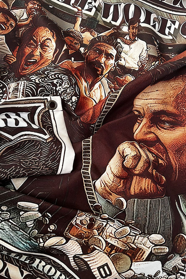 This tapestry is inspired by the all-time favorite, iconic movie Wolf of Wall Street. It leads you down the road of unmatchable power, wealth, and unapologetic indulgence. This tapestry is a symbol of embracing the spirit of the movie and is a symbol of financial prowess and the pursuit of the American dream. This tapestry is a unique vision of the movie caste incorporated within a $100 note, giving it the energy of the high-stake world of finance!